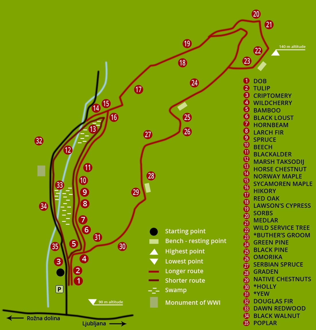On the map is longer and shorter route, with marked points of tree species and benches to rest. You can also see the location of the monuments from WW and starting point at parking lot near tunnel Panovec. To view the map in full size, just click on the image on the left or on the link to open it in another window. [_See the map_]