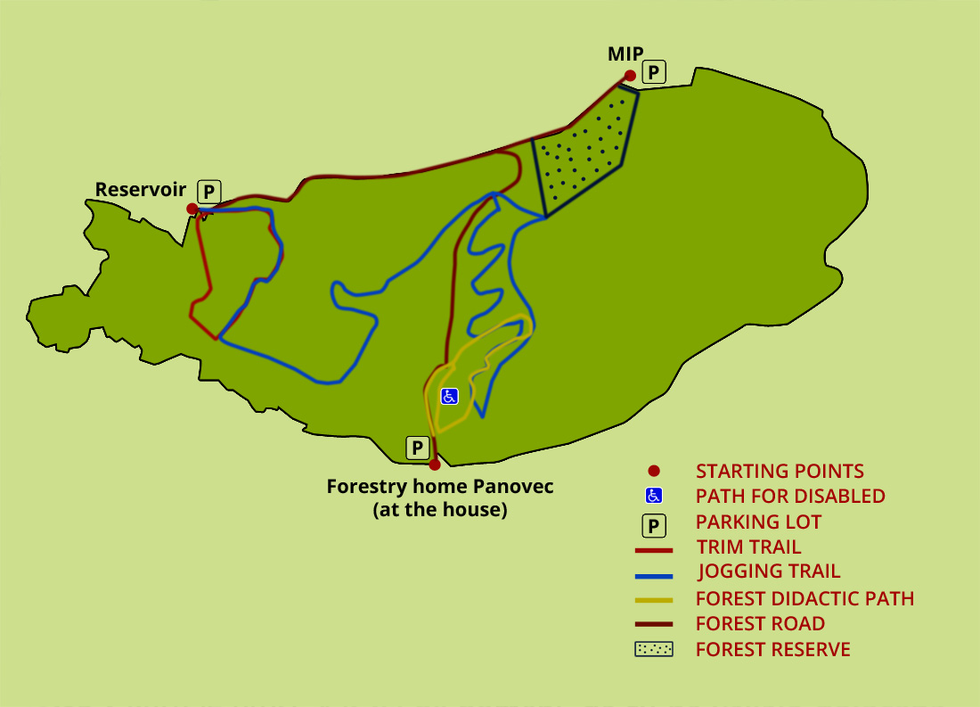 On the map of Panovec forest you can see various trails you can take – forest didactic path, trim trail, jogging trail or forest road. You can also see the forest reserve and parking lots with starting points. To view the map in full size, just click on the image on the left or on the link to open it in another window. [_See the map_]