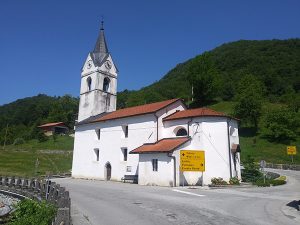 Cerkev Sv. Jurija stoji ob križišču cest, ki vodijo iz Grahovega v Most na Soči in iz Kneže ob potoku Kneža v Kneške Ravne, na zahodnem robu vasi. Tu se je nekoč nahajal farni sedež. Gre za podružnično cerkev župnijske cerkve Marije vnebovzete v Podmelcu. Cerkev je bila po potresu leta 1998 obnovljena in restavrirana.