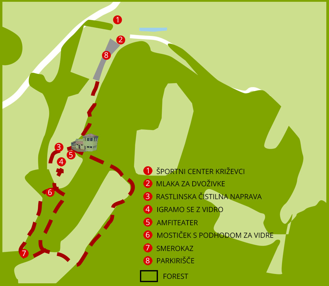 Ne zemljevidu parka Aqualutra so označene vse točke, ki jih lahko vidite med obiskom tega dela Slovenije. Nudi majhen vpogled v življenje vider in njeno življenjsko okolje. Za ogled zemljevida v polni velikosti, stisnite na sliko na levi ali na povezavo, da ga odprete v drugem oknu [_Poglejte zemljevid_]